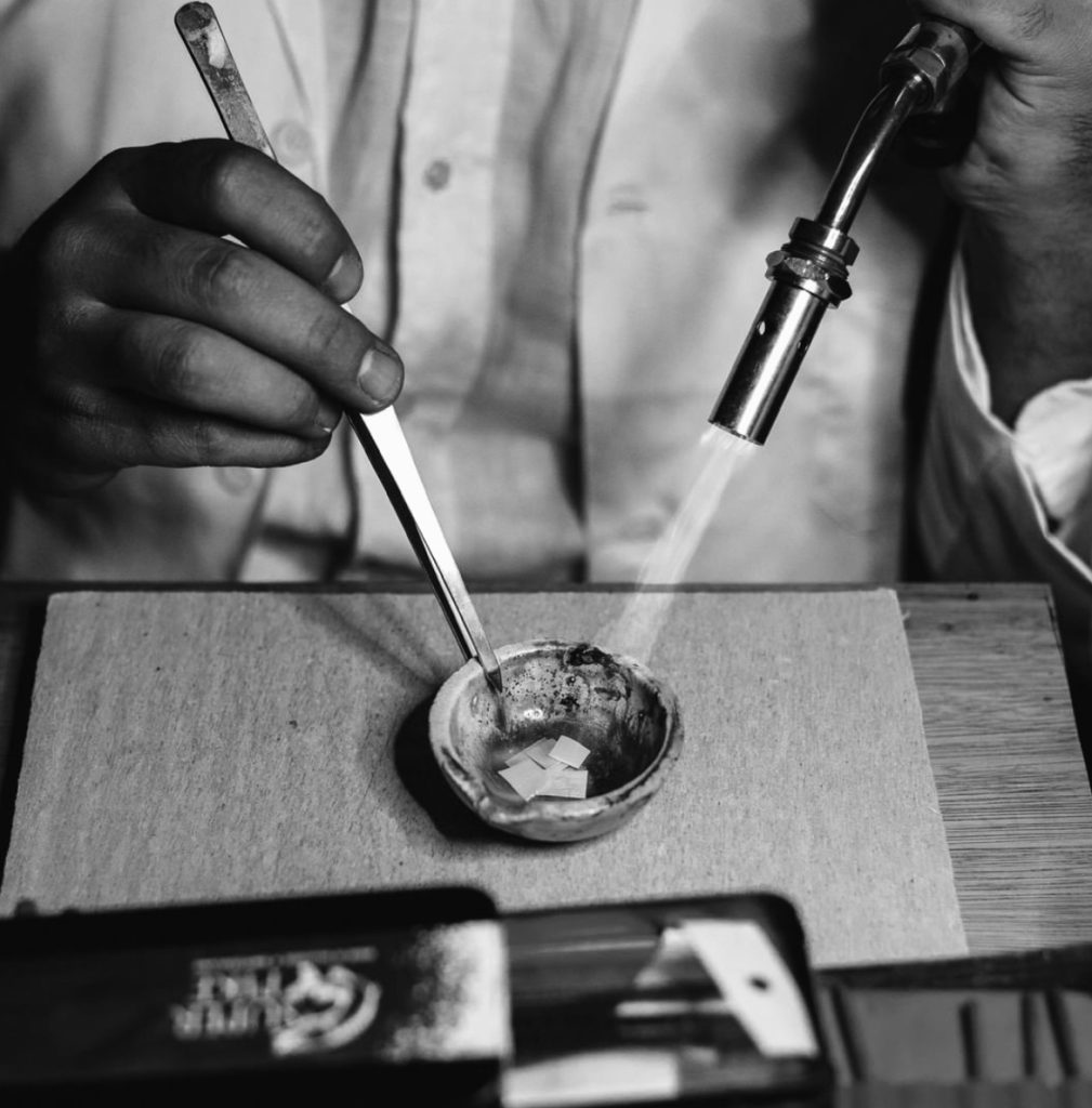All George korsa jewelry is designed, assembled and hand-finished in our Alexandria factory using only the finest 1000k silver and gold plated brass as well. Our team of local artisans are specialized in hand-piercing. Each silver piece is crafted and dyed by hand. Simple in form, with intricate details, George korsa continues to explore new techniques in design through dedication to craftsmanship and artistic creativity.